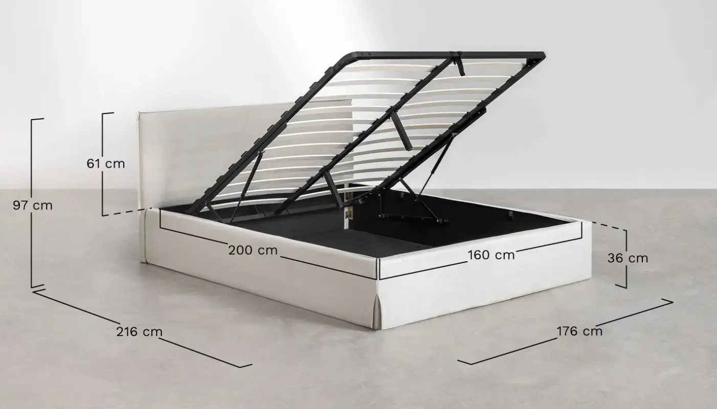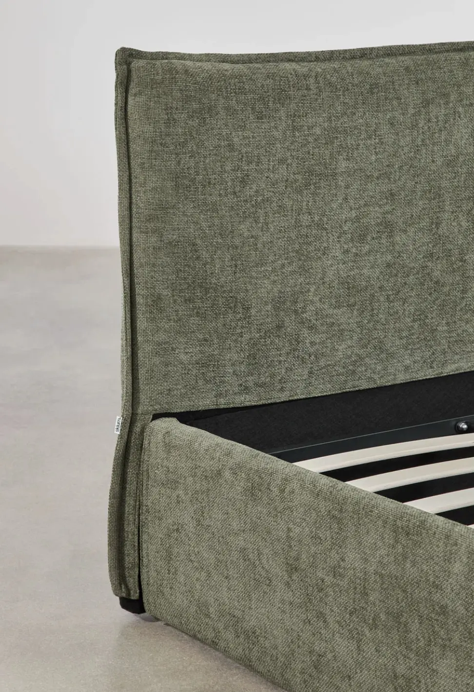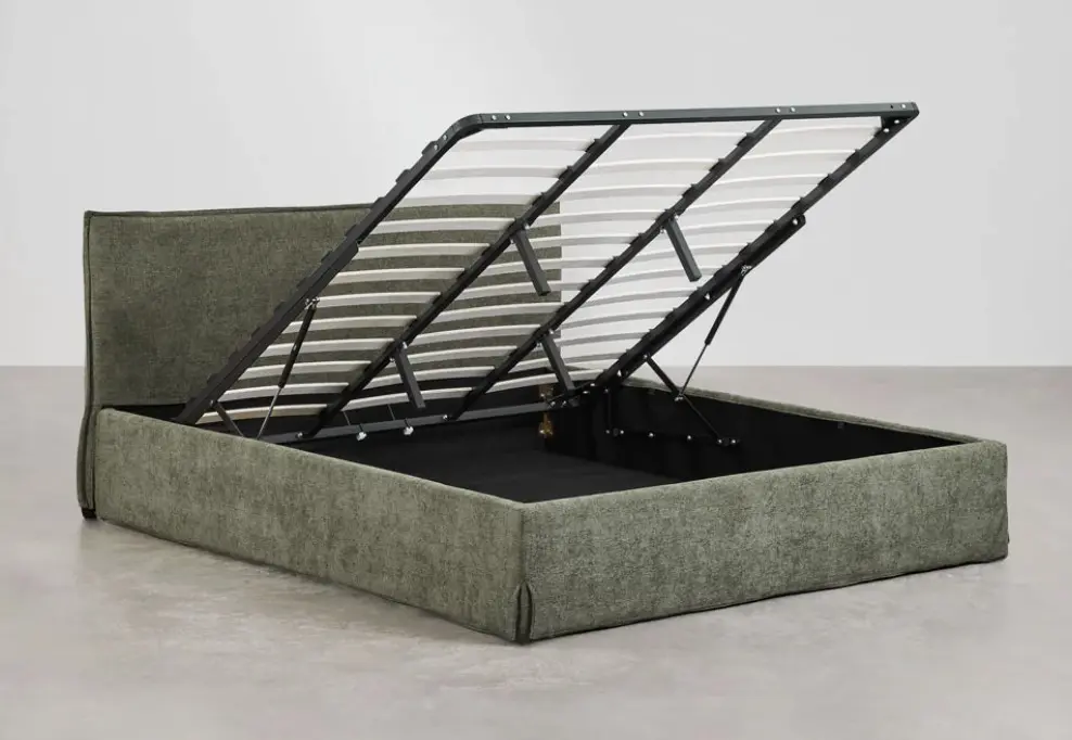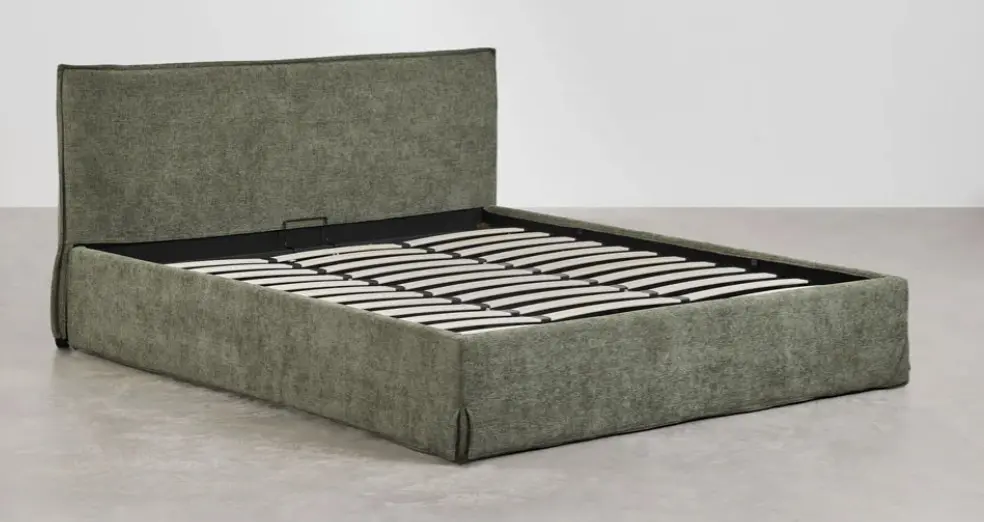 Bed for 180x200 cm mattress with lift-up storage base in sage green chenille.