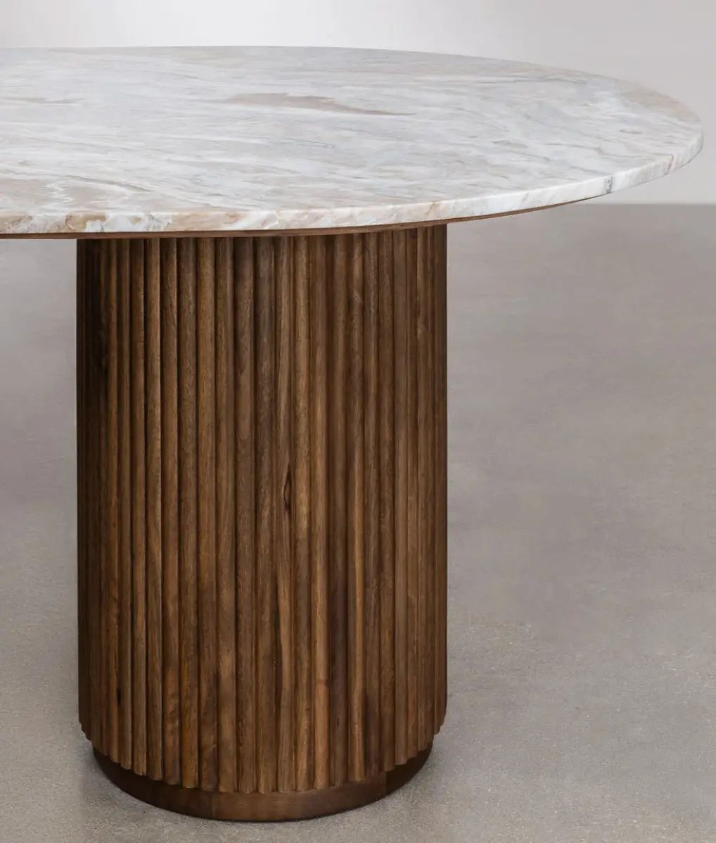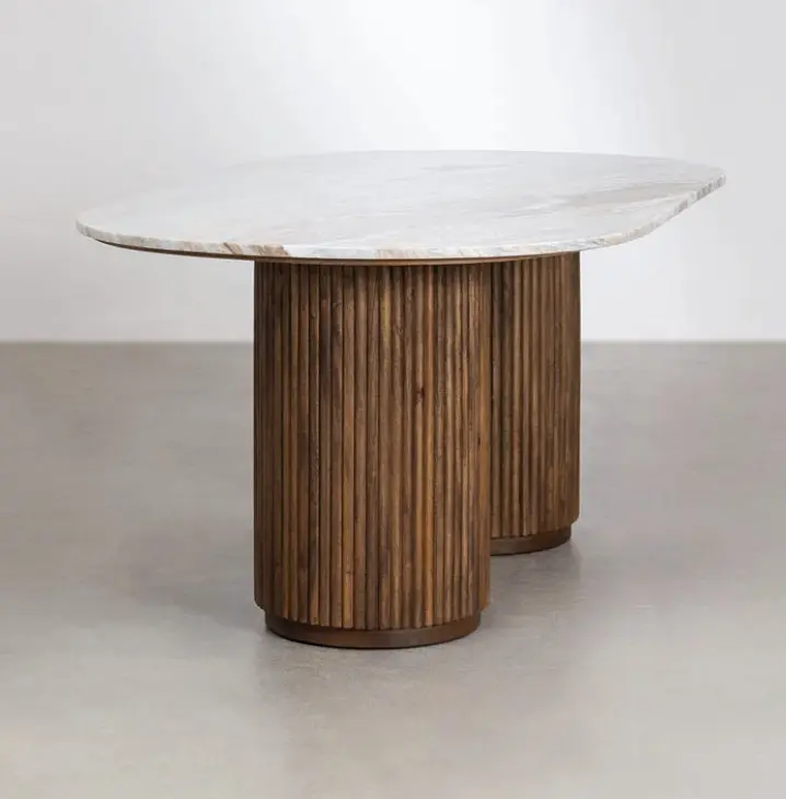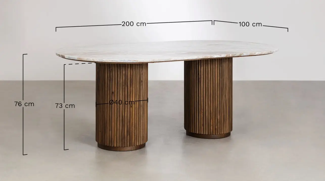 Oval dining table 200x100 cm in natural stone and mango wood.